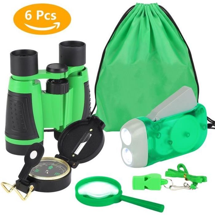 6 en 1 Kit Jouets dexplorateur Extérieur Enfants Avanture de Nature Inclus Jumelle Boussole Lampe Sifflet Loupe Sac à Dos