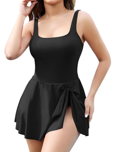 SHAPERIN Maillot de Bain Une Pièce Femme avec Jupette Monokini Gainant Ventre Plat Slimming Swimsuit Dress Robe de Bain, Noir, M