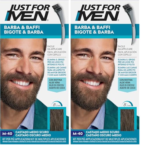 Just For Men Barbe & Moustache, teinture pour barbe homme, teinture sans ammoniaque, élimine les poils gris, avec peigne applicateur, couleur marron moyen foncé, M40 (Lot de 2)