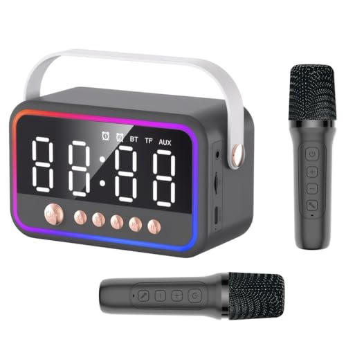 Machine Karaoke Colexy avec 2 microphones karaoké, haut-parleur Bluetooth avec lumière RVB et double alarmes, boîte de musique multifonction portable, haut-parleur Bluetooth avec son stéréo 360°