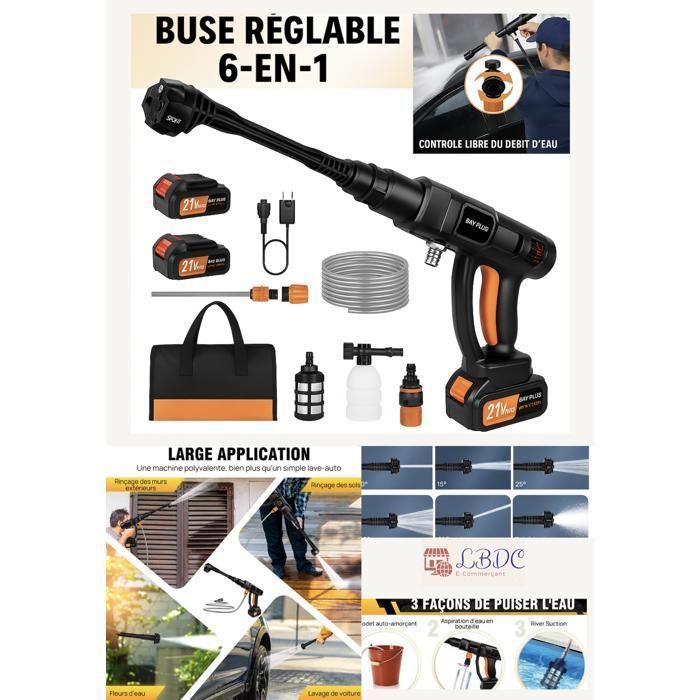 Nettoyeur haute pression sans fil 26 Bars (identique à RIOBY/KARCHER) - 2 Batteries de 21V 3000mAh - Buse 6-en-1 - Portable et
