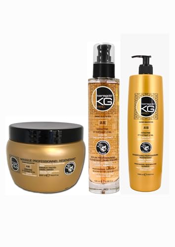 KERAGOLD PRO AB – Lot de 3 Soins Capillaires – Sans Sulfates Shampoing 1L + Masque 500ml + Sérum 100ml – Kératine & Extrait d’Ail – Fortifiant, Réparateur & Anti-Chute