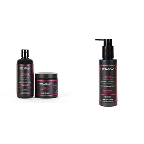 Kerargan - Ensemble Ultra Réparateur Shampoing, Après-shampoing, Masque & Sérum à la Kératine pour Cheveux Abîmés et Stressés - Revitalise & Protège - Sans Sulfate, OGM, Silicone - 3x500 ml + 100 ml