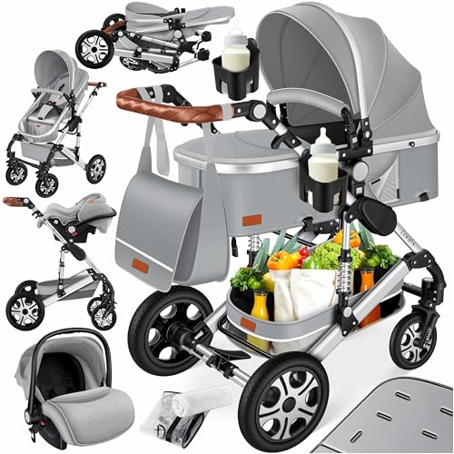 Ensemble poussette combinée 4 en 1 KESSER® avec nacelle, siège poussette, pneus en caoutchouc plein, sac à langer, protection contre la pluie, tablette pour enfant, ECE R129, Gris/Argent