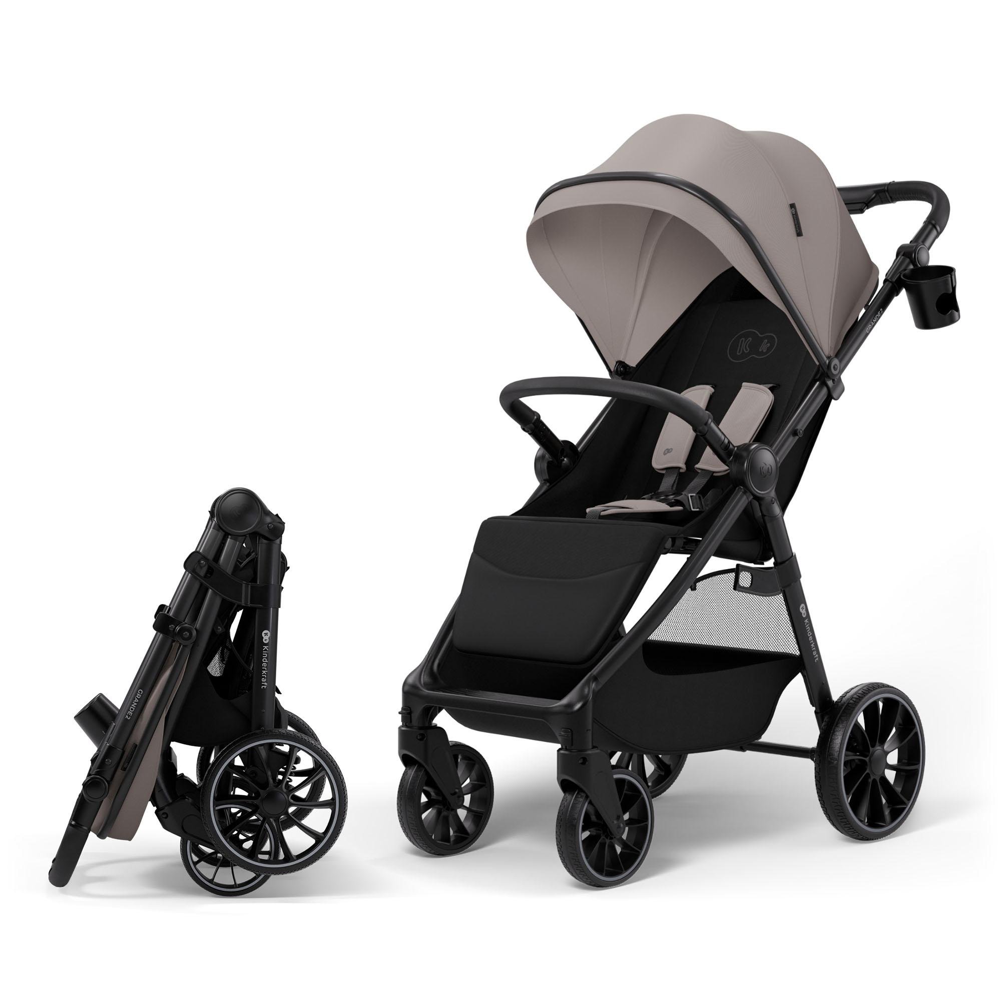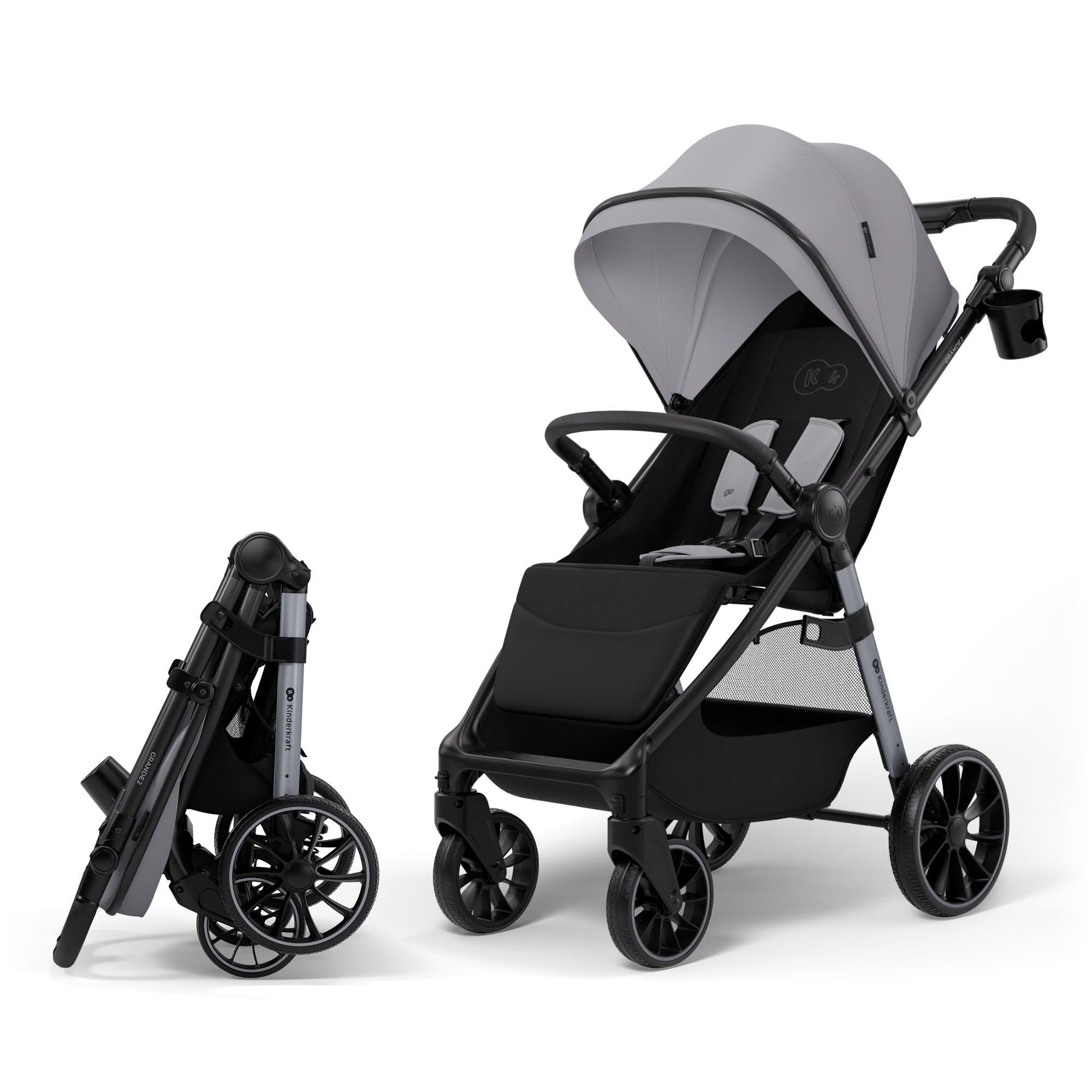 Kinderkraft GRANDE 2 – Poussette jusqu'à 22 kg, grandes roues à suspension, pliage d'une seule main, position allongée, poignée réglable, poussette de ville, gris