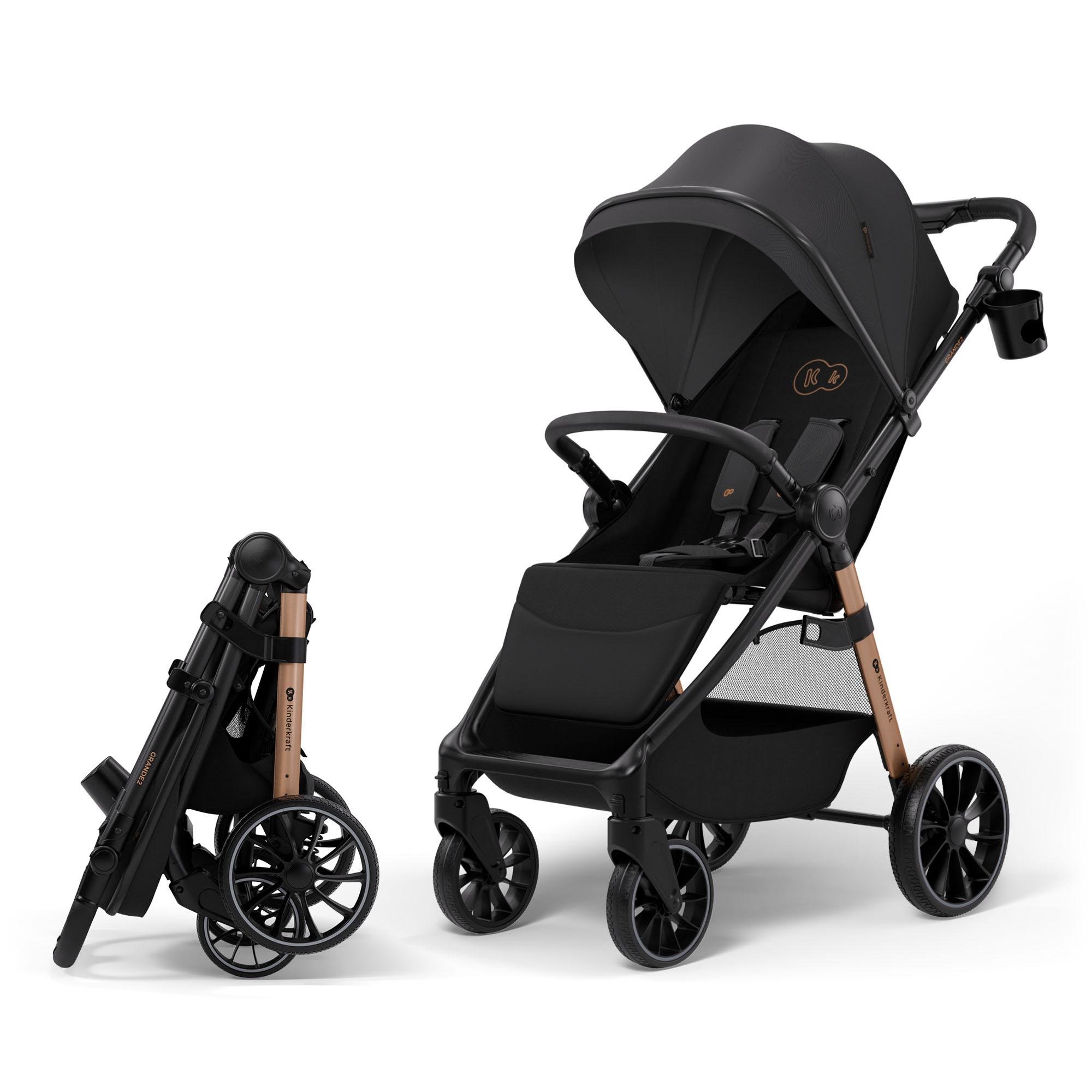 Kinderkraft GRANDE 2 – Poussette jusqu'à 22 kg, grandes roues à suspension, pliage d'une seule main, position allongée, poignée réglable, poussette de ville, noir