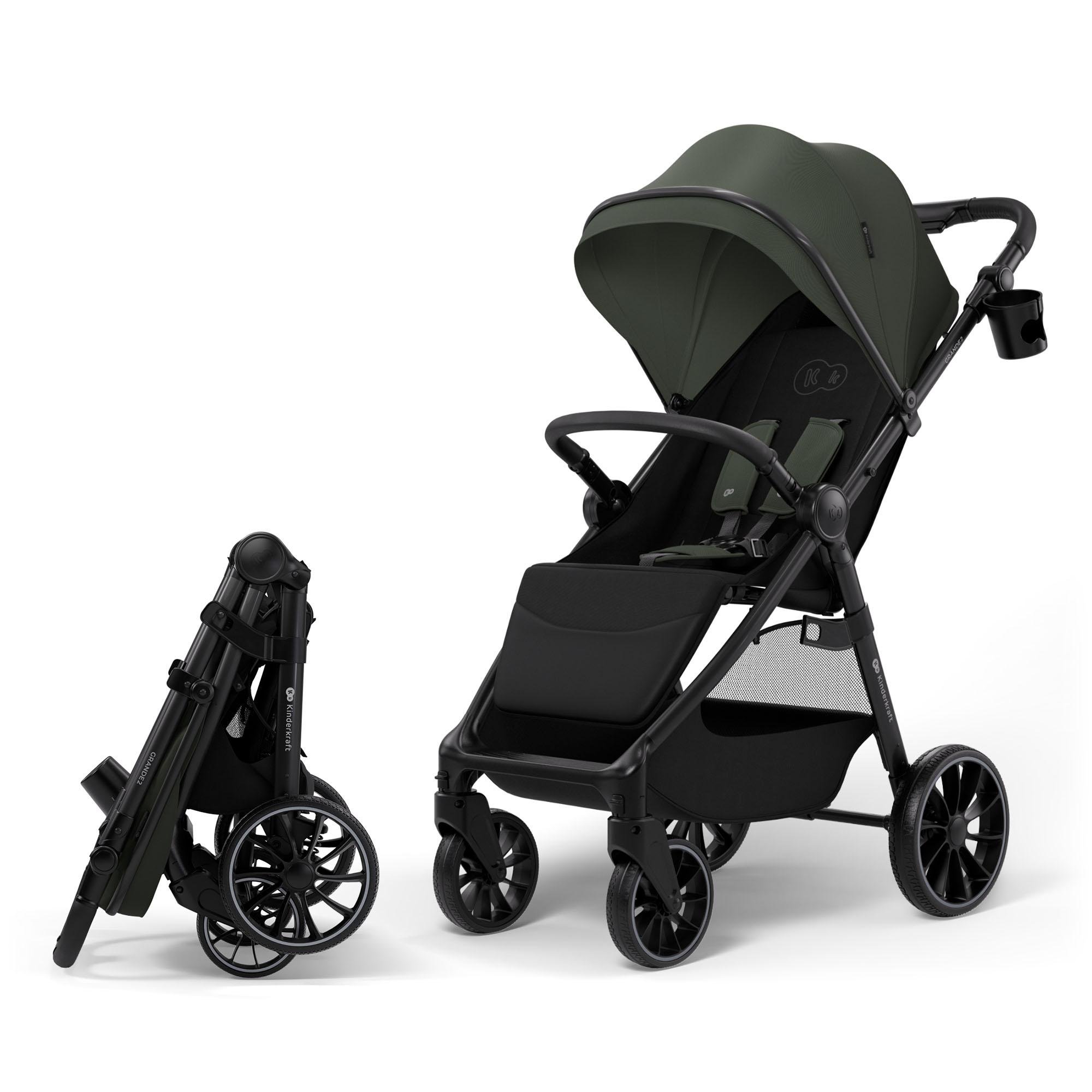 Kinderkraft GRANDE 2 – Poussette jusqu'à 22 kg, grandes roues à suspension, pliage d'une seule main, position allongée, poignée de poussée réglable, poussette de ville, vert