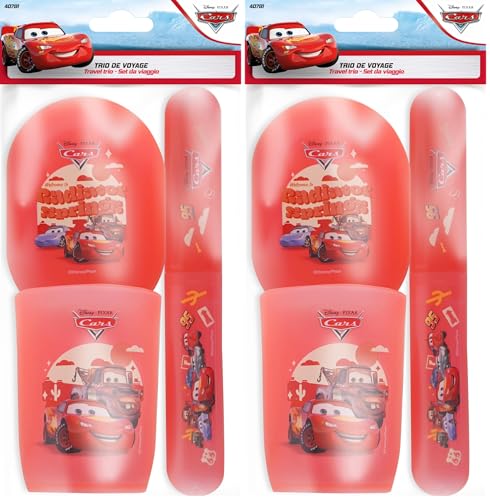 Disney Pixar Cars – Kit Voyage Toilette Trio Accessoires Bain Enfant Flash McQueen – Gobelet, Porte‑Savon, Étui Brosse à Dents – Plastique Robuste, Sûr – Hygiène - Produit Officiel Disney (Lot de 2)