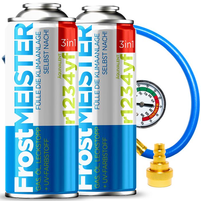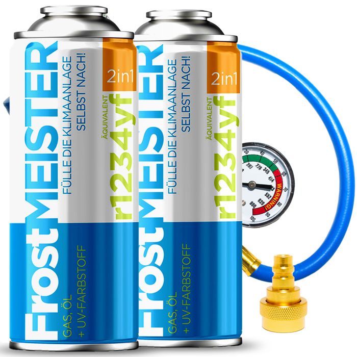 Kit Recharge Climatisation Voiture R1234yf - FROSTMEISTER 3in1 - 2x235g - Gaz Réfrigérant - Bombe Recharge Clim Auto