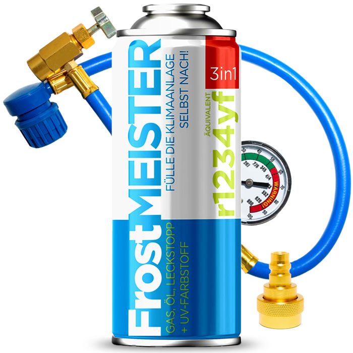 Kit Recharge Climatisation Voiture R1234yf - FROSTMEISTER 3in1 - 235g - Gaz Réfrigérant - Bombe Recharge Clim Auto