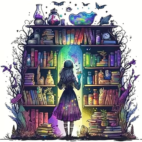 Kit Diamond Painting petite fille et livre de magie 5D, plante d'étagère Peinture Diamant Personnalisée, Broderie Diamant DIY pour Adultes et Enfants, Décoration Murale pour Salon, Chambre (30x30cm)