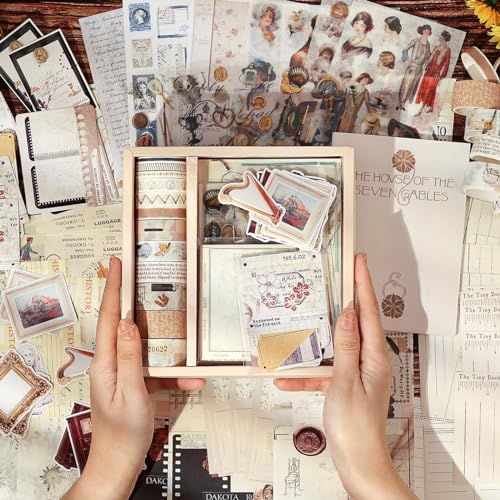 NOGAMOGA Kit de Scrapbooking Vintage, Set d'Accessoires de Junk Journal Antique avec Carnet A6, 12 Washi Tape, Autocollants, Accessoires de Bullet Journal Esthétiques