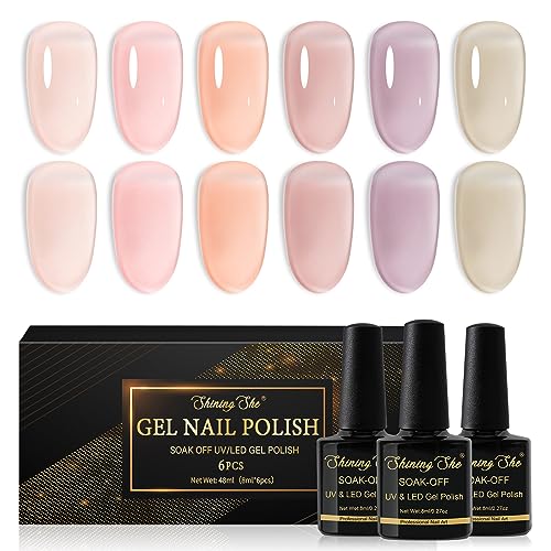Shining She Vernis Semi Permanent Transparent, 6 Couleurs Naturelle Milky Blanc Rose Nu Vernis à Ongles Gel Soak Off UV/LED Semi-permanent Manucure Kit Pour Salon De Manucure DIY Home, 8ml