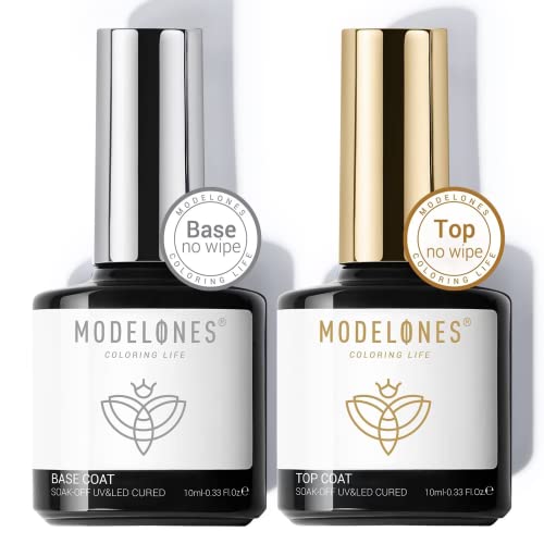 Modelones Top Coat Semi Permanent, No Wipe Base et Top Coat Vernis Semi Permanent 10ML*2 Vernis de Base et Finition Vernis à ongles Gel UV Manucure Kit