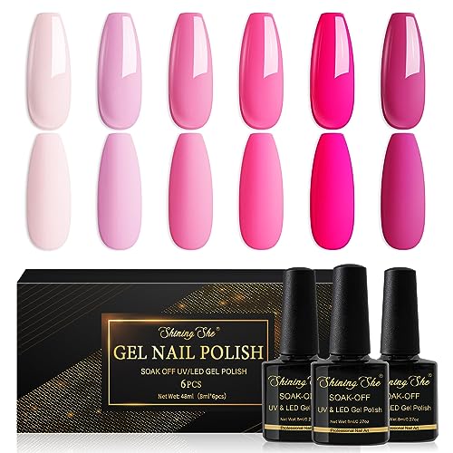 Shining She Vernis Semi Permanent, 6 Couleurs Rose Série Vernis à Ongles Gel Soak Off UV/LED Semi-permanent Manucure Kit Pour Salon De Manucure DIY Home, 8ml