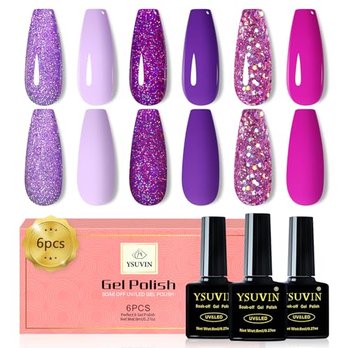 YSUVIN Vernis Semi Permanent, 6 Couleurs Pailleté Violet Lilas Rose Foncé Violet Diamant Brillant D'été Vernis Gel Ongles Soak Off UV Nail Art Salon Manucure Kit, Cadeaux Beauté