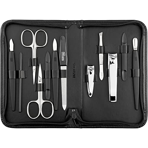 Kit manucure Solingen 12 pièces - kit ongle, coupe ongle, limes a ongles professionnelle, pince a epiler, repousse ongles, pousse cuticule, cuir noir