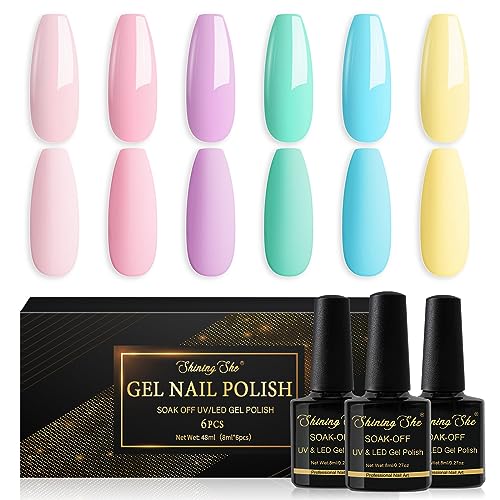 Shining She Vernis Semi Permanent Pastel, 6 Couleurs Rose Violet Vert Bleu Macaron Vernis à Ongles Soak Off UV/LED Semi-permanent Manucure Kit, 8ml
