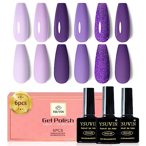 YSUVIN Vernis Semi Permanent Lilac, 6 Couleurs Belle Fantaisie Lilas Pure Violet Foncé Pailleté Vernis à Ongles Soak Off UV Pour Femme DIY Nail Art Manucure Kit Vernis Gel