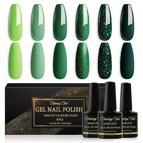 Shining She Vernis Semi Permanent, 6 Couleurs Cyan Vert Paillettes Vernis à Ongles Gel Soak Off UV/LED Semi-permanent Manucure Kit Pour Salon De Manucure DIY Home, 8ml