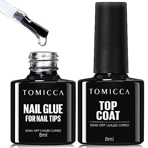 TOMICCA Top Coat et Colle Ongle 8 en 1, No Wipe Top Coat Semi Permanent, Gummy Base Gel Ongles Pour Américaine, Soak Off Gel UV LED, Manucure Kit 8 ML 2 PCS