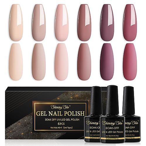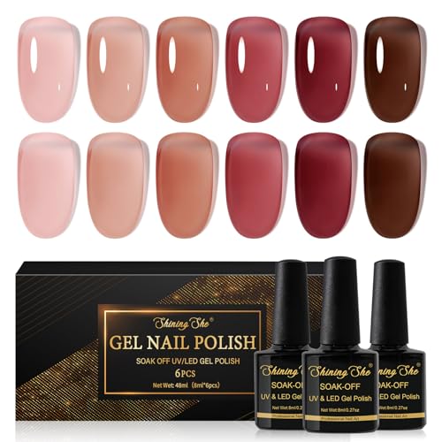Shining She Vernis Semi Permanent, 6 PCS Naturelle Rose Nude Brun Transparent Gelée Vernis à Ongles Gel Soak Off UV/LED Gel UV Semi Permanent Manucure Kit Pour Salon De Manucure DIY Home, 8ML