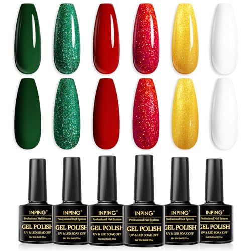 INPING Vernis Semi Permanent Noël,6 Couleurs Or Blanc Rouge Vert Pailleté Vernis Gel UV Semi Permanent Kit,Soak Off UV/LED Vernis à Ongles Cadeaux de Vacances pour Femmes,8ML