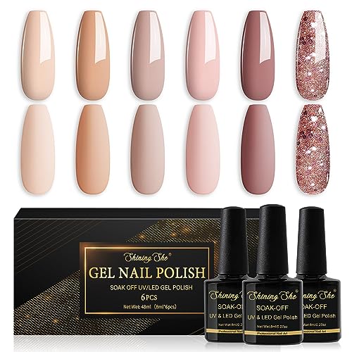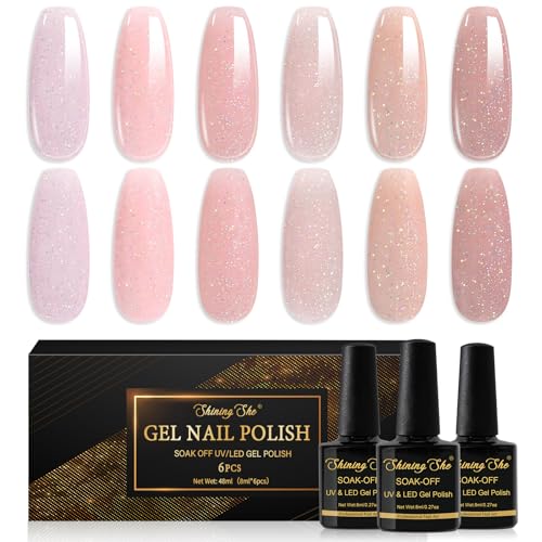 Shining She Vernis Semi Permanent Nudee, 6 Couleurs Rose Nude Champagne Paillettes Vernis à Ongles Gel Soak Off UV/LED Semi-permanent Manucure Kit Pour Salon De Manucure DIY Home, 8ml