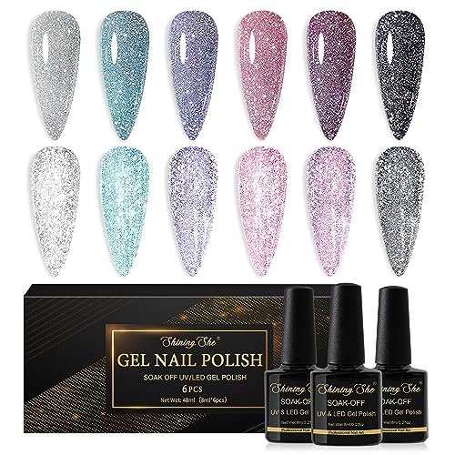 Shining She Vernis Semi Permanent Pailleté Reflechissante, 6 Couleurs Reflective Vernis à Ongles Gel Paillettes Soak Off UV/LED Semi-permanent Manucure Kit Pour Salon De Manucure DIY Home, 8ml