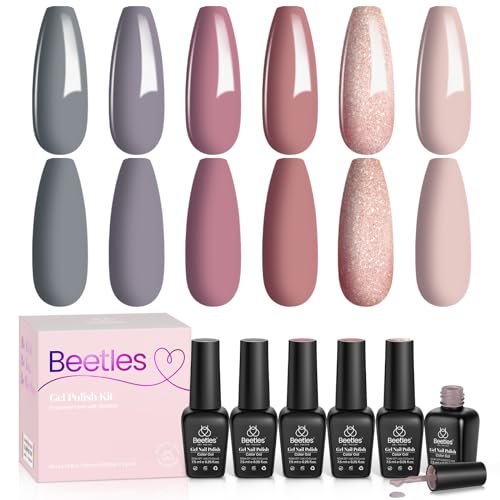 Beetles Vernis Semi Permanent 6 Couleurs, Charme Doux Lot de Vernis à Ongles Gels Rouge Nude Rose Paillettes, Sèche sous Lampe UV/LED, Cadeaux pour Femmes Kit de Manucure