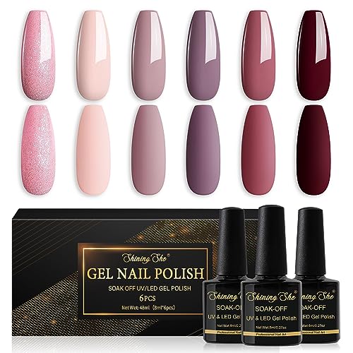 Shining She Vernis Semi Permanent, 6 Couleurs Rose Foncé Taupe Rouge Foncé Beige Vernis à Ongles Gel Soak Off UV/LED Semi-permanent Manucure Kit Pour Salon De Manucure DIY Home, 8ml