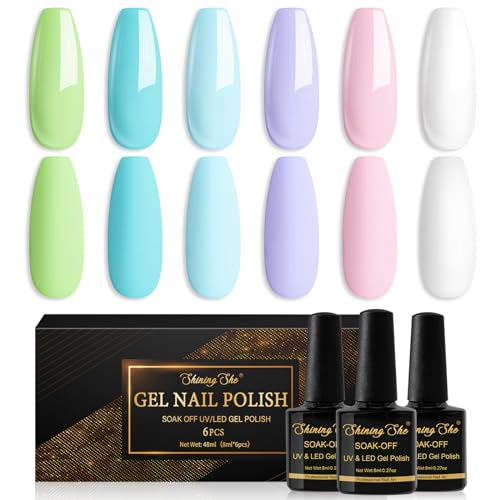 Shining She Vernis Semi Permanent Pastel, 6 Couleurs Vert Bleu Violet Rose Blanc cassé Macaron Vernis à Ongles Soak Off UV/LED Semi-permanent Manucure Kit, 8ml