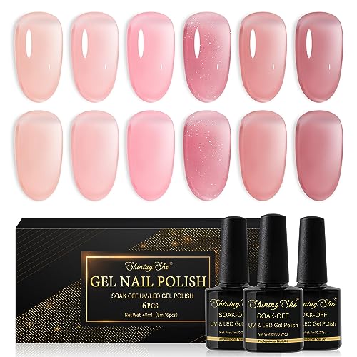 Shining She Vernis Semi Permanent, 6 PCS Naturelle Rose Nudee Transparent Gelée Vernis à Ongles Gel Soak Off UV/LED Gel UV Semi Permanent Manucure Kit Pour Salon De Manucure DIY Home, 8ML
