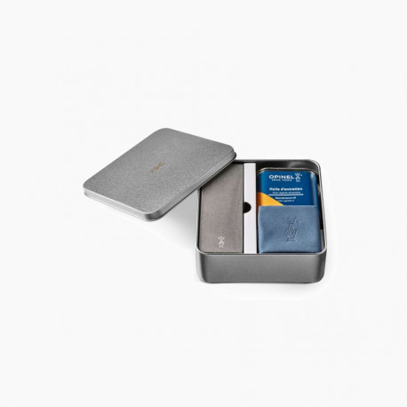 Opinel - Kit d’Entretien pour Couteaux - 1 Boîte de Rangement, 1 Grande Pierre d’Affûtage, 1 Bidon d’Huile, 1 Chiffon Microfibre 20 x 20 cm - Garantie à Vie