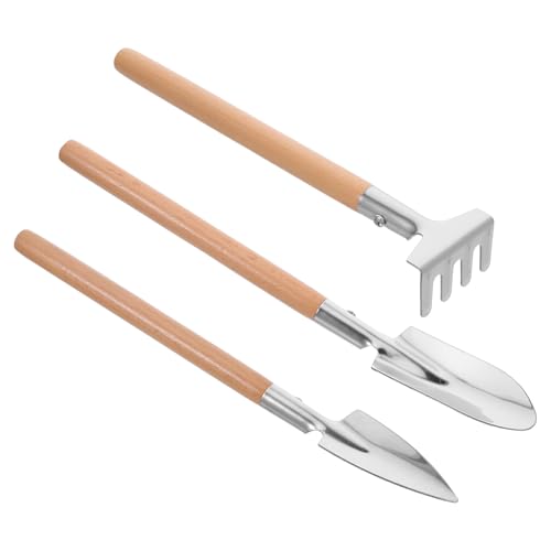 GARIOUANS Kit Mini Outils de Jardinage à Main 3 Pièces Truelle, Râteau et Pelle en Métal avec Manches en Bois, Petit Ensemble Portable pour Plantation Fleurs, Entretien Bonsaïs, Jardinage