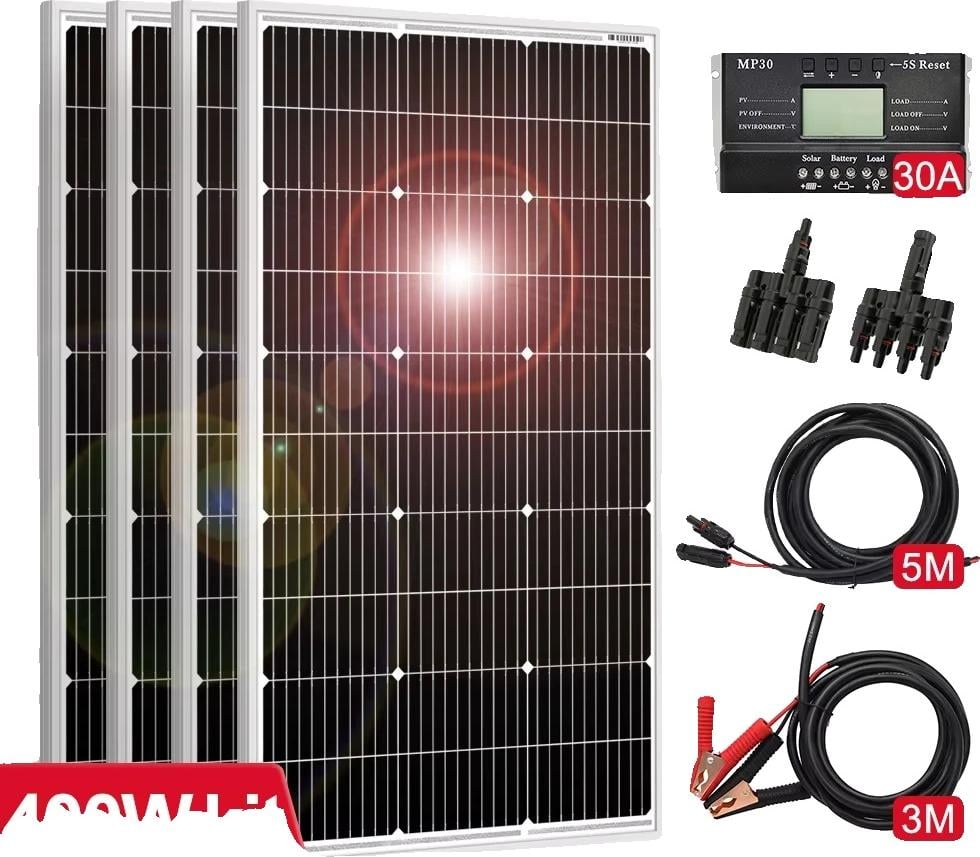 Heumbio Kit De Panneau Solaire 400W, 12V 24V avec ContrôLeur De Charge Solaire 40 A Et CâBle D'Extension, avec Clips De Batterie pour Bateau, Moto, Maison, éClairage ExtéRieur, Camping-Car,Black