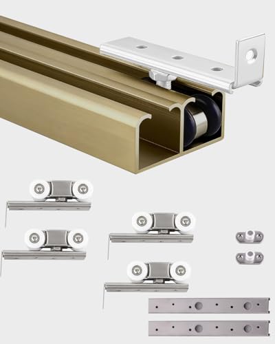 Minglez Kit Porte Coulissante 1200 1400 1600 1800 2000 mm Rails et roulettes pour Portes de Placard Coulissantes, Kit de Quincaillerie pour Porte Coulissante Double(Champagne Gold,3200mm/126 inch)