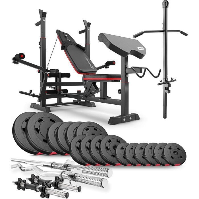 Ensemble dhaltères 39 kg Hop-Sport Banc de Musculation Poulie haute HS-1065 Set Disques de Poids en fonte et Barres dhaltères