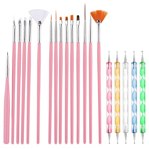 20 Pcs Lot de Pinceau Ongle Gel,15pcs Pinceaux pour Nail Art avec 5pcs Double Extrémité Nail Art Dotting Pen,Pinceaux à Ongles de Vernis à Ongles en Acrylique pour Décoration DIY Nail Art Design