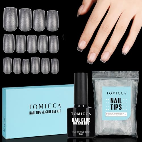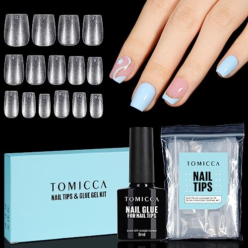 TOMICCA Carré Court Capsules Ongles & 4 en 1 Colle Faux Ongles Kit, Transparent Couverture Capsule Americaine Ongle pour Diy Nail Art, 150 Pièces 15 Tailles