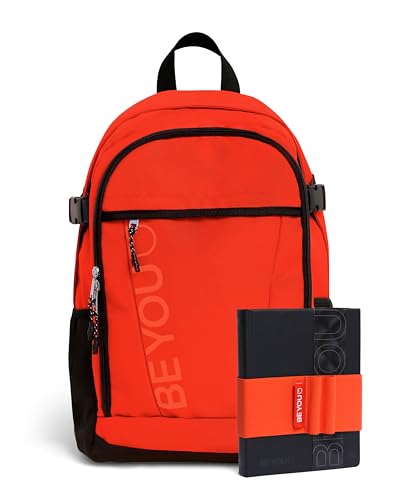 BE YOU - Sac à dos scolaire de loisirs avec poche avant, poche intérieure pour PC, dossier rembourré 28,5 x 42,5 x 16 cm - 24 LT, journal daté 25-26 et bandeau porte-stylos, kit couleur corail