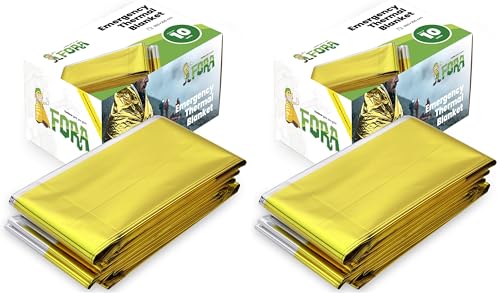 FORA Couvertures Thermiques d'urgence - Kit de Survie avec 10 unités, 160 x 210 cm, Double Face, doré/argenté, Ultra légères et compactes (Lot de 2)