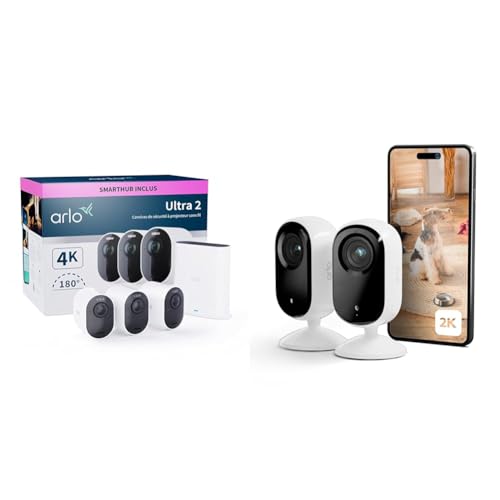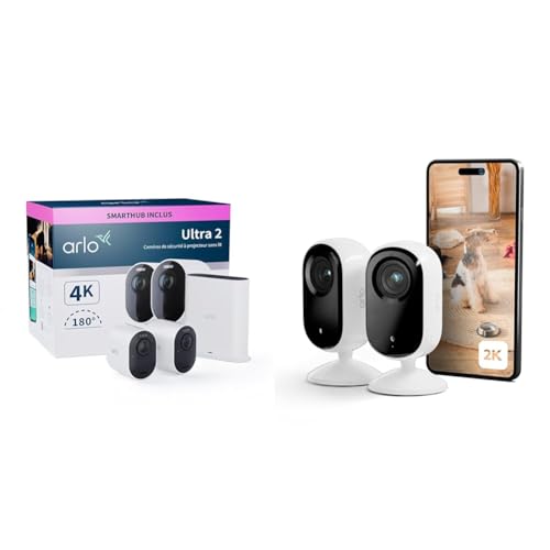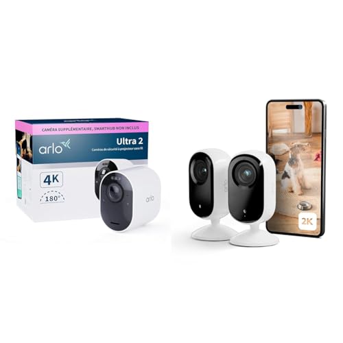 Arlo Ultra 2 4K avec SmartHub Plus Caméras intérieure (2), Caméra Video Surveillance WiFi Exterieure sans Fil, Vision Nocturne Couleur, Compatible Alexa, Essai Secure Inclus, 2 Caméras Blanches