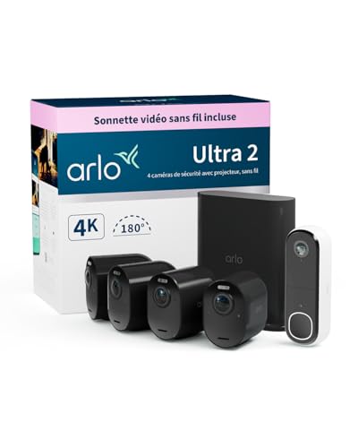 Arlo Ultra 2 4K avec SmartHub Plus Sonnette vidéo, Caméra Video Surveillance WiFi Exterieure sans Fil, Vision Nocturne Couleur, Compatible Alexa, Essai Secure Inclus, Pack de 4 Caméras Noirs