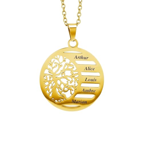 Collier Arbre de Vie Personnalisé (1 à 5 Prénoms) – Pendentif Famille Gravé – Idée Cadeau Femme & Maman – Expédié depuis la France – Finition Dorée ou Argentée (Or)