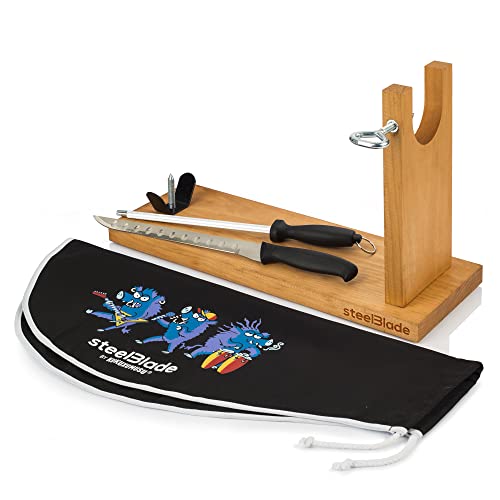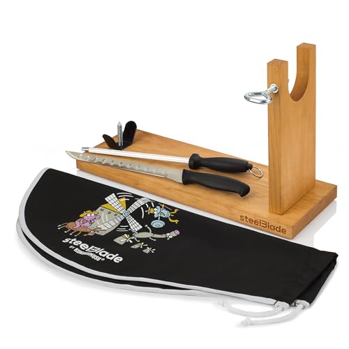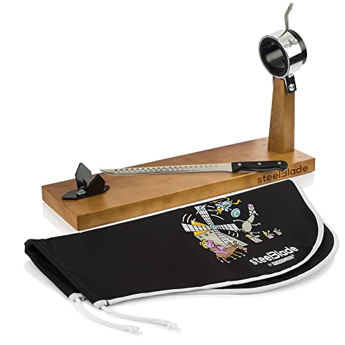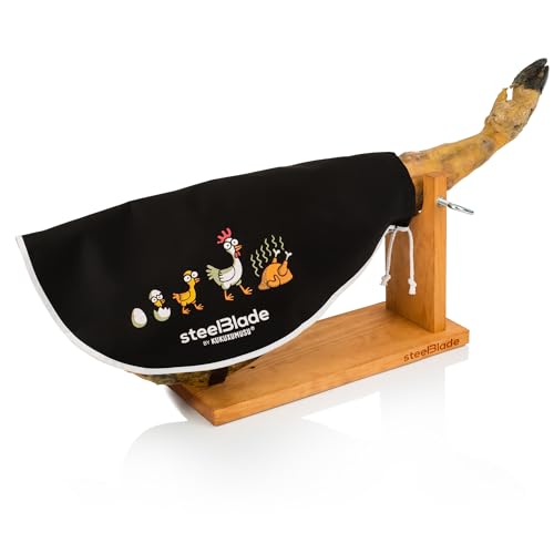 steelBlade - Support à jambon rotatif à 360° en bois laqué + couvre-jambon Kukuxumusu + couteau à jambon 28 cm - Fabriqué en Espagne - 2 positions pour jambon et palettes (011132)