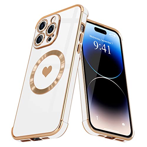 L-FADNUT Coque pour iPhone 14 Pro Coque Compatible avec MagSafe Motif Cœur Galvanisé Antichoc Résistante Silicone Étui pour iPhone 14 Pro Blanc