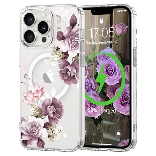L-FADNUT Coque Magnétique pour iPhone 14 Pro Max [Coque Compatible avec MagSafe] Transparente Silicone Motif de Fleur Fine Antichoc Étui de Protection pour iPhone 14 Pro Max Pourpre