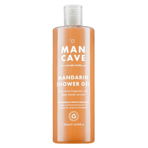 ManCave Gel Douche à la Mandarine 500 ml, Riche Arôme Boisé d'Agrumes, Gel Douche Hommes Naturel avec L-Arginine et Aloe Vera, Végétalien, Tube Plastique Recyclé, Fabriqué en Angleterre