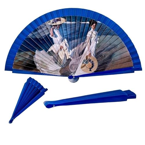 DRW Éventail en Bois décoré avec l'œuvre Dames sur la Plage Tons Bleus 42 cm